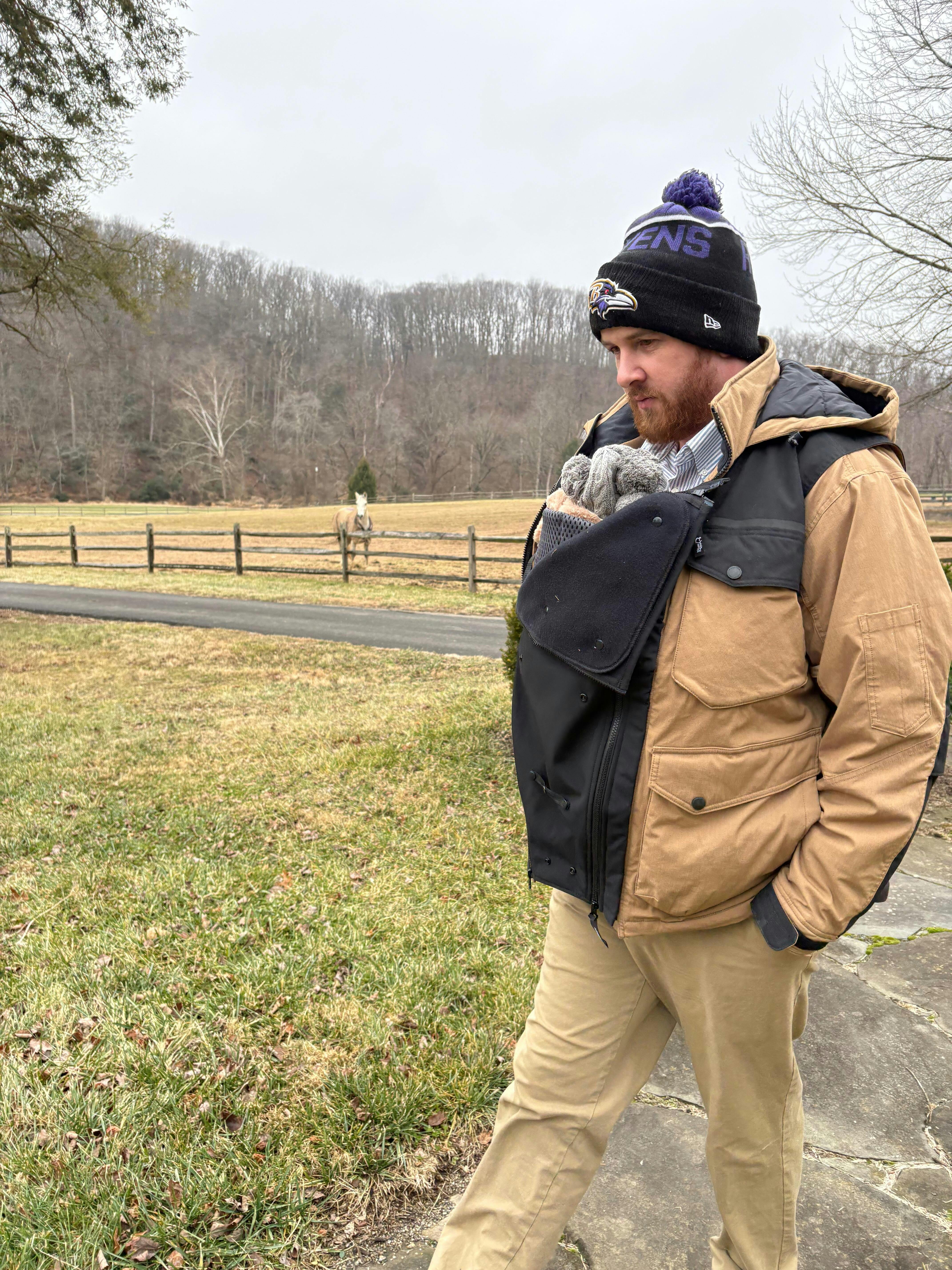 The Universal Jacket Extender is a softshell extender that expands the front of your own jacket during pregnancy. While baby-carrying with a soft-structured front-carrier, wrap or sling, the extender expands your jacket around you and your baby, for close comfort and warmth while outdoors.